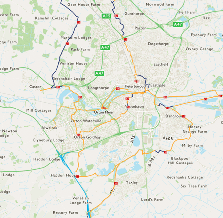 Mae Llwybr 12 yn cyrraedd llwybr di-draffig ochr yn ochr â Grafham Water drwy ambell lwybr ceffyl ac adran ar y ffordd, gan barhau i Peterborough ar y ffordd ond am ddarn di-draffig trwy Huntingdon (mae bwlch yn y llwybr o gyrion Huntingdon i Stilton). Gan anelu i'r gogledd allan o Peterborough mae'r llwybr yn defnyddio trac pen banc i Crowland ac mae'n parhau trwy isffyrdd i ganol Spalding.