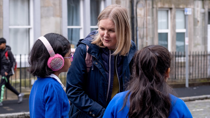 Bu Karen McGregor yn siarad â'r disgyblion am eu profiadau o'r newidiadau newydd ar strydoedd yr ysgol. Credyd: Walk Wheel Cycle Trust, 2024