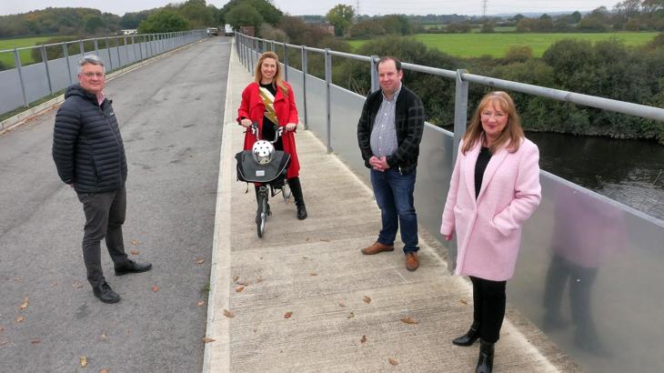 James Lewis, Rosslyn Colderley, y Cynghorydd Matthew Morley a'r Cynghorydd Kim Groves yng Nghastellford i Wakefield Greenway.