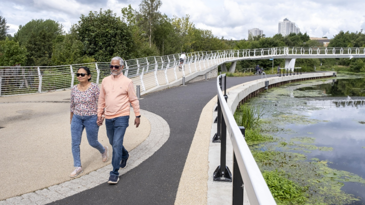 Mae Stockingfield Bridge yn darparu croesfan ddiogel a hygyrch i bobl sy'n byw ac yn gweithio yng ngogledd Glasgow. ©Walk Wheel Cycle Trust/McAteer, 2023