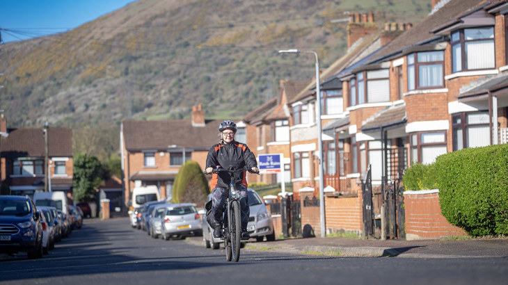 Archwilio strydoedd Belfast gydag ymdeimlad newydd o ryddid ar ei e-feic. Credyd: J Bewley