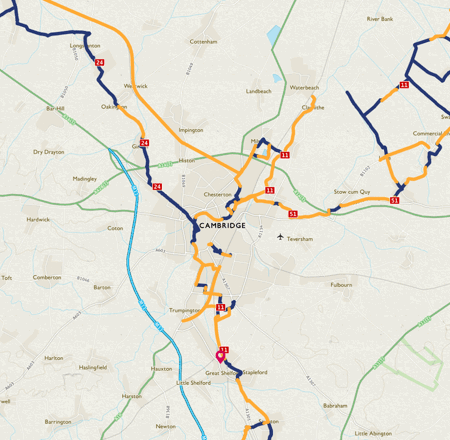 From Great Shelford, the route follows a path alongside the railway to Addenbrooke's Hospital before joining roads and cycle paths heading towards the centre of Cambridge. Care is needed in Cambridge city centre which can be quite busy. From Cambridge, the route follows the River Cam to Waterbeach.