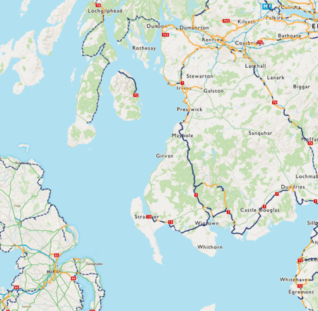 Please note: there are short gaps in National Cycle Network Route 7 south of Ayr, south of Castle Douglas and three short gaps between Gretna and Dumfries.