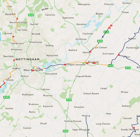 The section between Bingham to Bottesford is open and runs from the A46 using cycle lanes and shared-use paths through Bingham and along the A52 to Whatton, where it leaves the A52 and runs on lightly trafficked roads through to Bottesford.