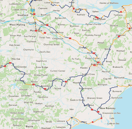 The route is open and signed from Canterbury to Royal Tunbridge Wells. There is a gap between Mystole and the A28 near Godmersham, and near Dingleden.