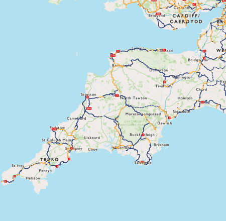 Heading north the route passes Camelford and the edge of Bodmin Moor on the way to the seaside resort town of Bude in north Cornwall.
