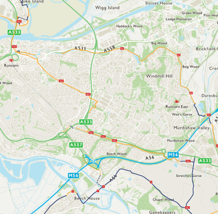 From Widnes through Runcorn to Aston mainly follows traffic-free paths alongside major roads.