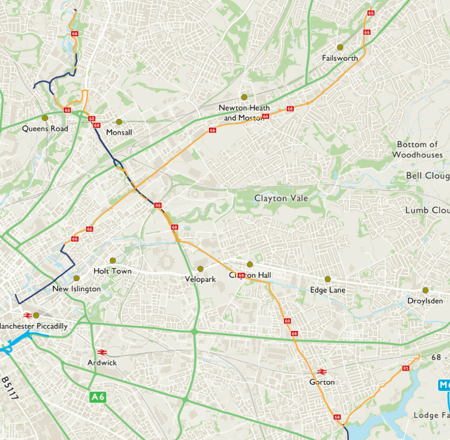 The route is described here from East Manchester to North Manchester but is signed in both directions. National Route 60 is fully open and signed between the northernmost edge of Houldsworth Golf Course in Reddish - from where it branches off from National Route 6 - and Harpurhey.