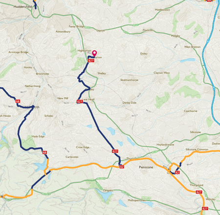 This route travels from Kirkburton on local roads through the lovely villages of Stocksmoor, Shepley, Haddingley and Royd Moor.