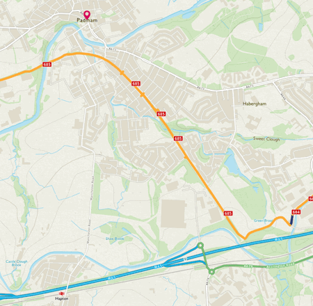 This short route through the Padiham Greenway park creates links between local town centres, employment areas and schools. It provides a link with Burnley city centre via Route 604 at Molly Wood Lane, by the Leeds and Liverpool Canal.