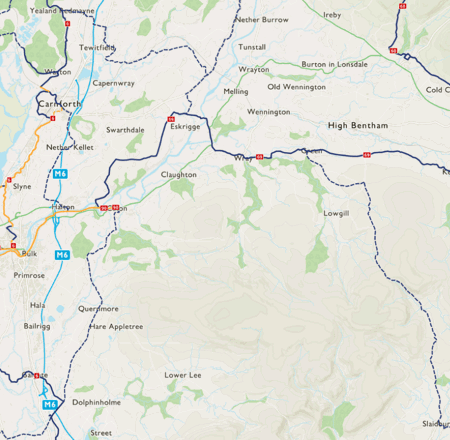 Between Morecambe and Caton the route follows the trackbed of an old railway line, and then makes its way to Clapham on roads.
