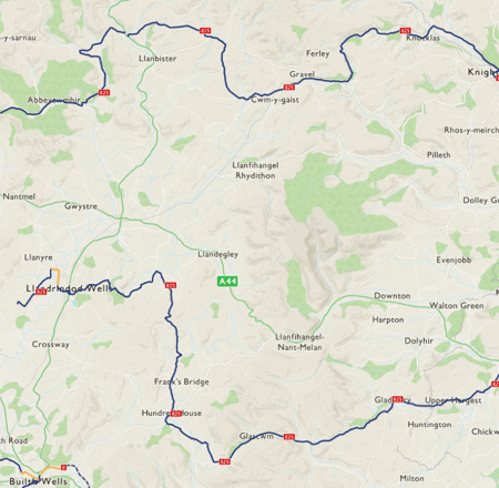 Starting at Rhayader, the route predominantly runs through Powys but in the East, the route creeps back and forth over the Welsh English border into Herefordshire passing through Kington, Presteigne and Knighton.