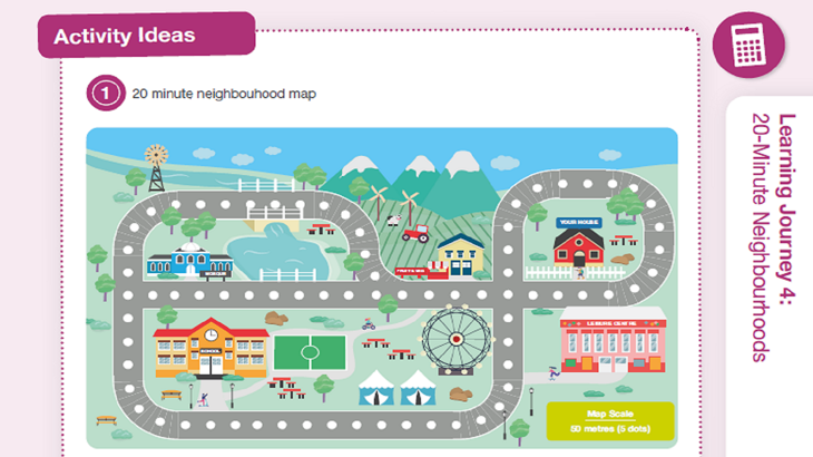 A numeracy activity idea around 20-minute neighbourhoods, taken from the new resource for children and teachers.